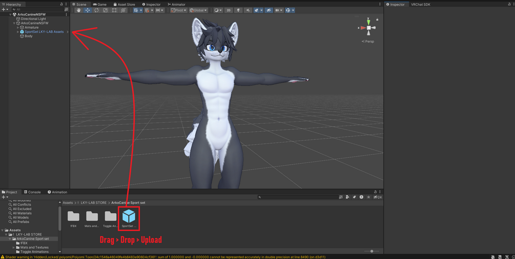 ( Warmers for both arms and legs, a shirt and shorts ) all with optimized textures and materials, with easy to setup drag and drop and ready to upload with VRCFury, you will get a new submenu with 5 toggles and a hue wheel with icons! The stripes you toggle on can be edited to any color desired.