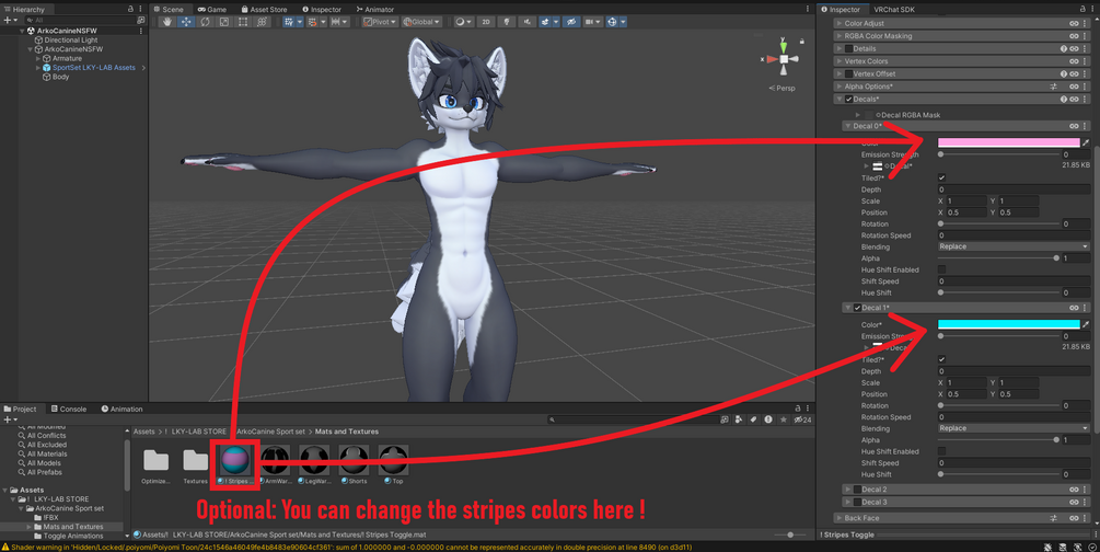 ( Warmers for both arms and legs, a shirt and shorts ) all with optimized textures and materials, with easy to setup drag and drop and ready to upload with VRCFury, you will get a new submenu with 5 toggles and a hue wheel with icons! The stripes you toggle on can be edited to any color desired.